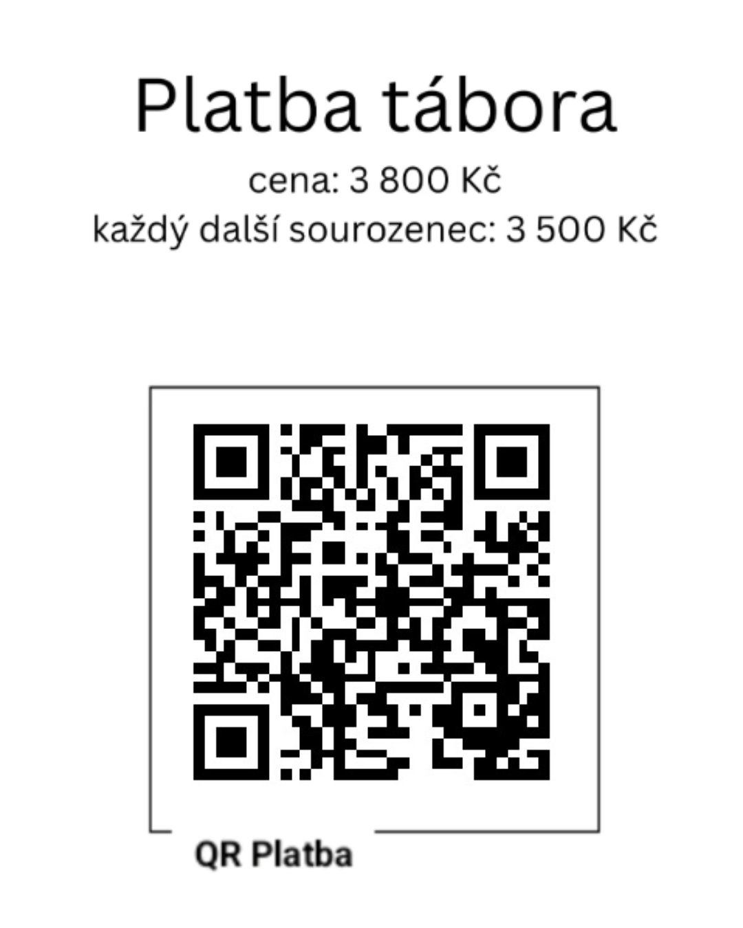 Platba: táborné se platí pomocí QR kódu níže. Do poznámek napište prosím jméno dítěte.